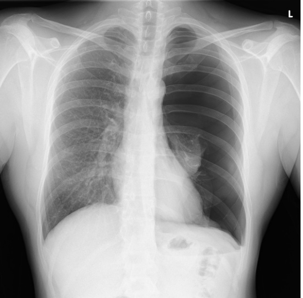 The diagnosis given on radiopaedia.org is “Large left sided pneumothorax with total collapse of the left lung. Minor mediastinal shift. Heart size normal. Right lung clear.”