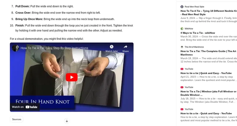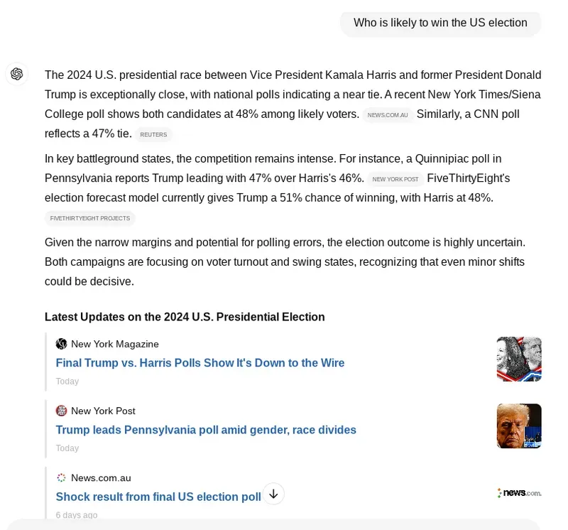 It's not afraid to answer political questions, drawing from several sources to produce its answer. Alongside are news sites.