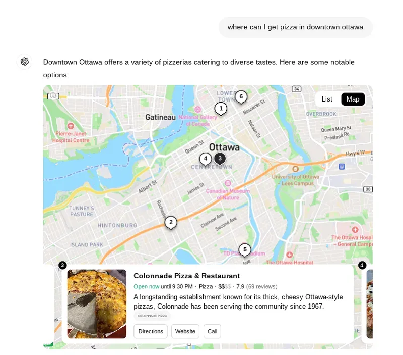 It gives good recommendations in a carousel you can scroll through, including my favourite - Colonnade Pizza. If you click on Directions it opens up a Google map. Or you can go to their website or call them directly.