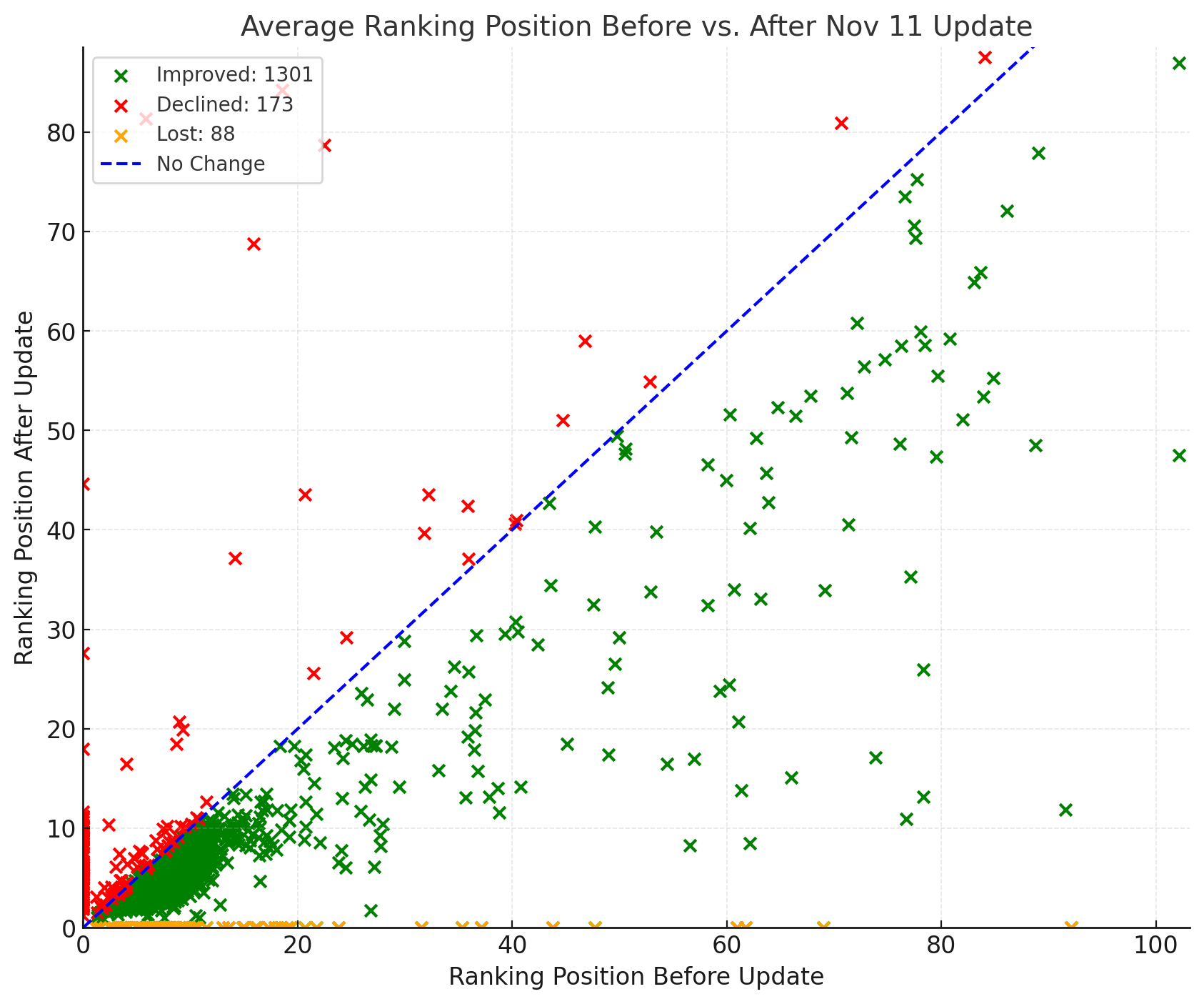 It's not perfect. Despite me giving it instructions to make improved keywords green and declined ones red, I often need to remind the GPT of this. And it struggles to understand lost and new keywords as you can see in the chart below. Yet, I find this very helpful. We can see that this site has had nice improvements in rankings of many, but not all keywords following the November 11 core update.