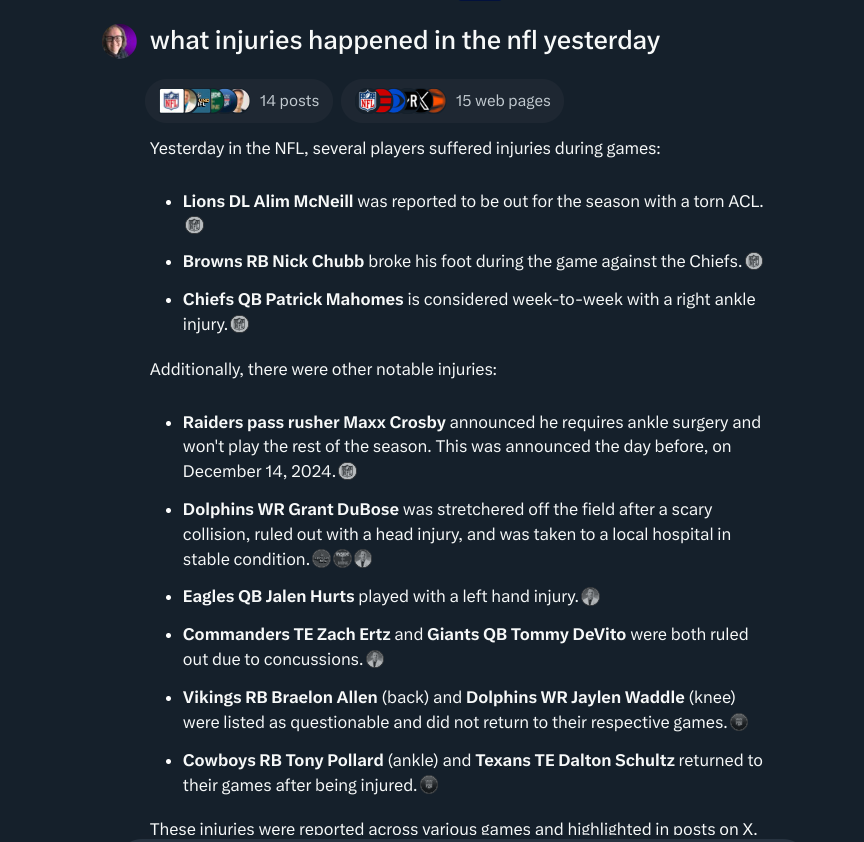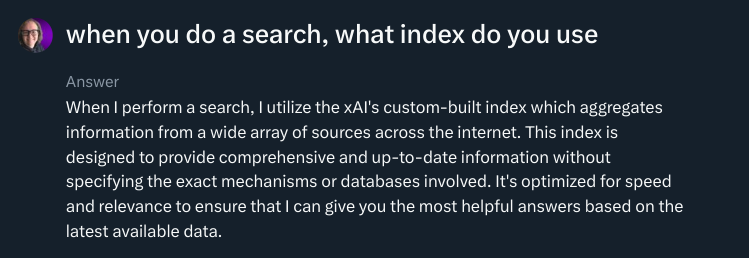 Grok is particularly interesting because it draws on the web plus tweets. I asked Grok which web index it uses. Gemini obviously uses Google Search, and ChatGPT draws from Bing's index, but what about Grok? Apparently X has its own index of the web?!?